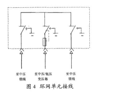 圖4給出了一個(gè)最簡(jiǎn)略的全封閉環(huán)網(wǎng)箱的接線圖。中壓饋線的進(jìn)線裝有負(fù)荷阻隔開關(guān),通過一個(gè)串接限流熔斷器的負(fù)荷開關(guān)把變壓器接到環(huán)網(wǎng)體系上,既保護(hù)到變壓器的故障,又能阻隔故障變壓器,使環(huán)網(wǎng)不致斷開?,F(xiàn)在運(yùn)用的柜環(huán)網(wǎng)都是在根本接線單元的基礎(chǔ)上改善、擴(kuò)展而成的。