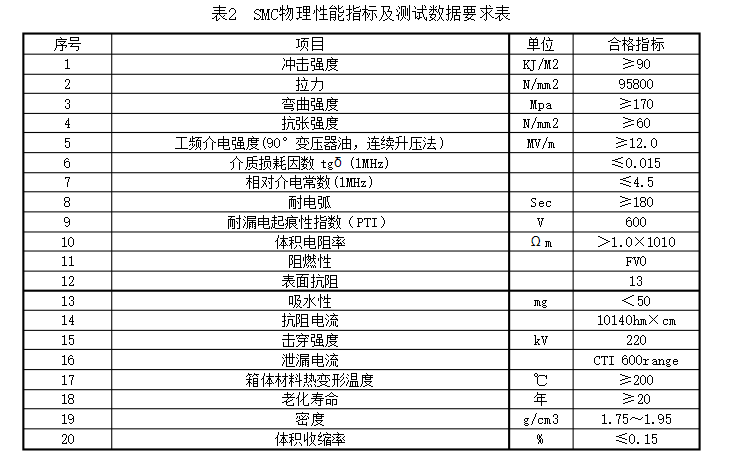 2.3.1分支箱外殼選用S304不銹鋼資料,箱體、門體資料厚度均不該小于2毫米,或SMC復(fù)合資料箱體,SMC物理功能指標(biāo)及測試數(shù)據(jù)滿意表2的要求。