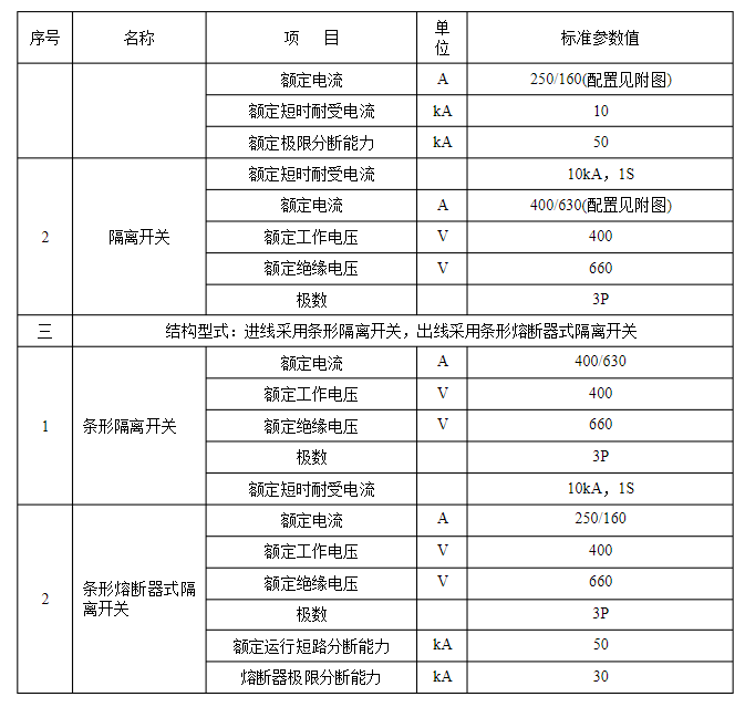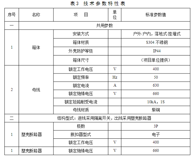 2.3.11在使用中可以互換的具有同樣額定值和結(jié)構(gòu)的組件,應(yīng)具有互換性。?3?規(guī)范技術(shù)參數(shù)?技術(shù)參數(shù)特性表是對收購設(shè)備的基礎(chǔ)技術(shù)參數(shù)要求,供貨方應(yīng)對技術(shù)參數(shù)特性表中規(guī)范參數(shù)值進(jìn)行呼應(yīng)。低壓電纜分支箱技術(shù)參數(shù)特性見表3