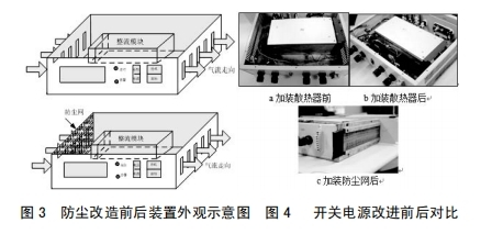 3.2在設(shè)備本體進(jìn)風(fēng)孔加防塵網(wǎng),避免塵土進(jìn)入設(shè)備內(nèi)部,設(shè)備維護(hù)人員定時(shí)對(duì)濾網(wǎng)間斷清掃,然后減輕元器件外表覆塵,利于設(shè)備正常散熱,如圖3所示加裝防塵網(wǎng)后開關(guān)電源標(biāo)明圖。對(duì)設(shè)備施行上述改善后,其改善前后對(duì)比如圖4所示。