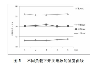 改善后,為考證改善作用,對(duì)開關(guān)電源分別在0.5倍、0.8倍及1.0倍負(fù)載下間斷了為期5天的帶負(fù)荷實(shí)驗(yàn),圖5為不同負(fù)載下開關(guān)電源的溫度曲線,由圖5可知,跟著負(fù)荷的增大,開關(guān)電源問題整體呈上升趨向;負(fù)載不變的情況下,同一溫度曲線根柢堅(jiān)持滑潤;開關(guān)電源在額定負(fù)載下作業(yè),最高溫度不超越57℃,未達(dá)報(bào)警值,開關(guān)電源穩(wěn)定性得到明顯前進(jìn)。
