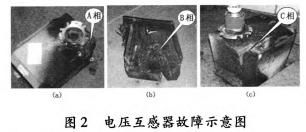 2012年3月26日,檢修人員連夜對35kV垣潔線56號線路電壓互感器進行撤除查看,發(fā)現(xiàn)電壓互感器A、B、C相損壞,A、B相有迸裂現(xiàn)象;B相PT損害嚴峻,側(cè)壁脫離本體,插頭墜落,繞組完全毀損;A相PT插頭墜落,外表漆層及噴鋁層受損;C相外表漆層及噴鋁層受損,其它部位正常,如圖2所示。