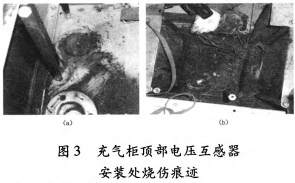 查看35kV垣潔線56號線路電壓互感器上端柜頂,發(fā)現(xiàn)柜頂插拔處燒損,斷路器室壓力開釋設備動作。將壓力開釋通道翻開后,發(fā)現(xiàn)本柜斷路器室壓力開釋盤動作,壓力開釋通道有許多燃弧噴出的落塵。翻開斷路器室入孔后,發(fā)現(xiàn)氣室內(nèi)有燃弧痕跡。氣室內(nèi)其它絕緣件未受損,銅排和充氣柜柜體外表有落塵無燒傷痕跡,如圖3所示。