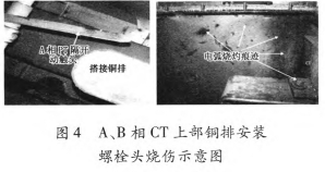 斷路器氣室內(nèi)部PT阻隔開關A相動觸頭變形,未搭在接觸銅排上,端頭有顯著炙烤痕跡;B相動觸頭端頭有燒傷痕跡;A相CT旁氣室壁有顯著燒傷痕跡;A相和B相CT上部銅排設備螺栓頭燒傷,斷路器室頂部方位有電弧燒傷痕跡,如圖4所示。